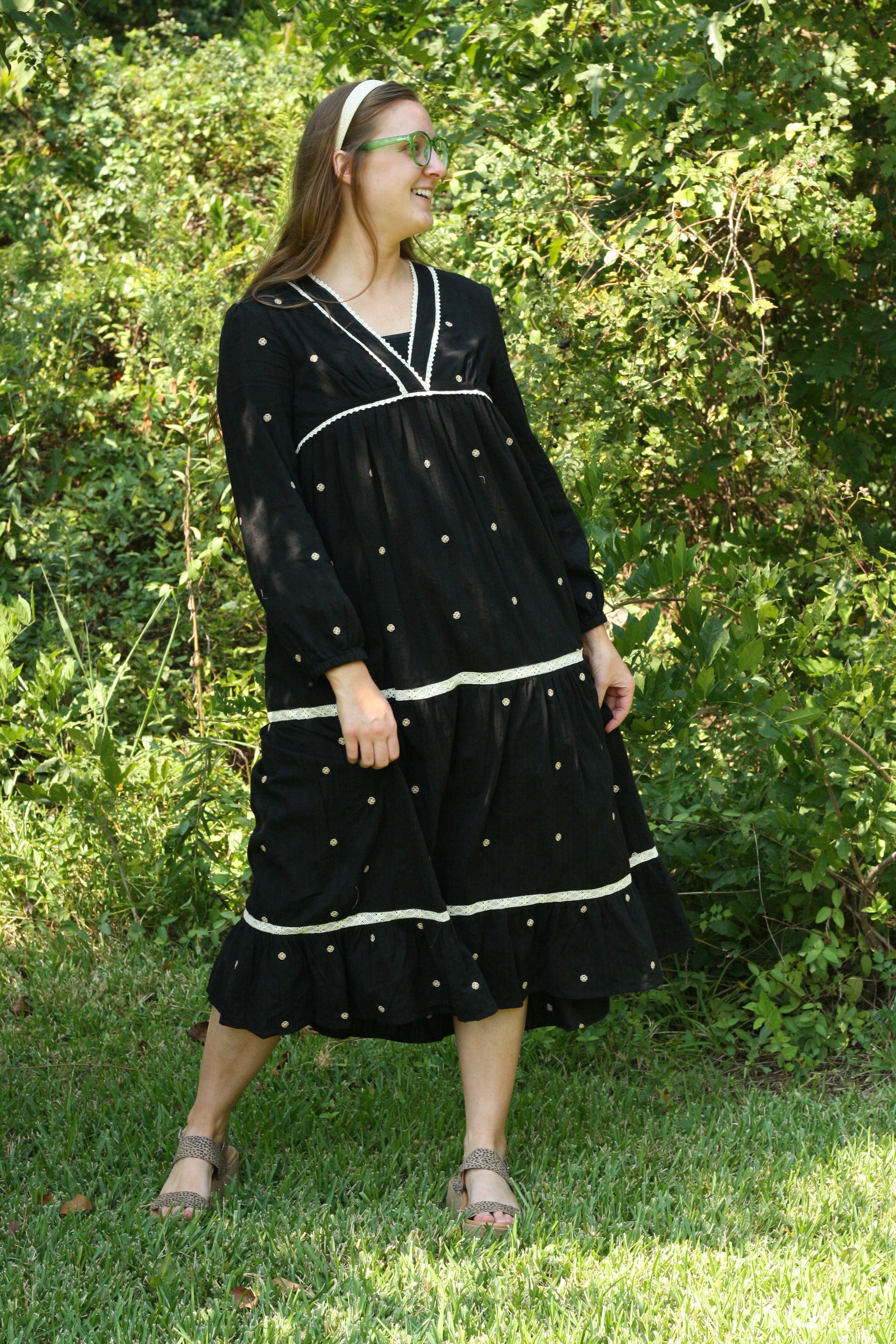 A timeless black dress with all-over embroidery, cream trim, and long sleeves. Fully lined with a side zipper for a sleek, comfortable fit.
