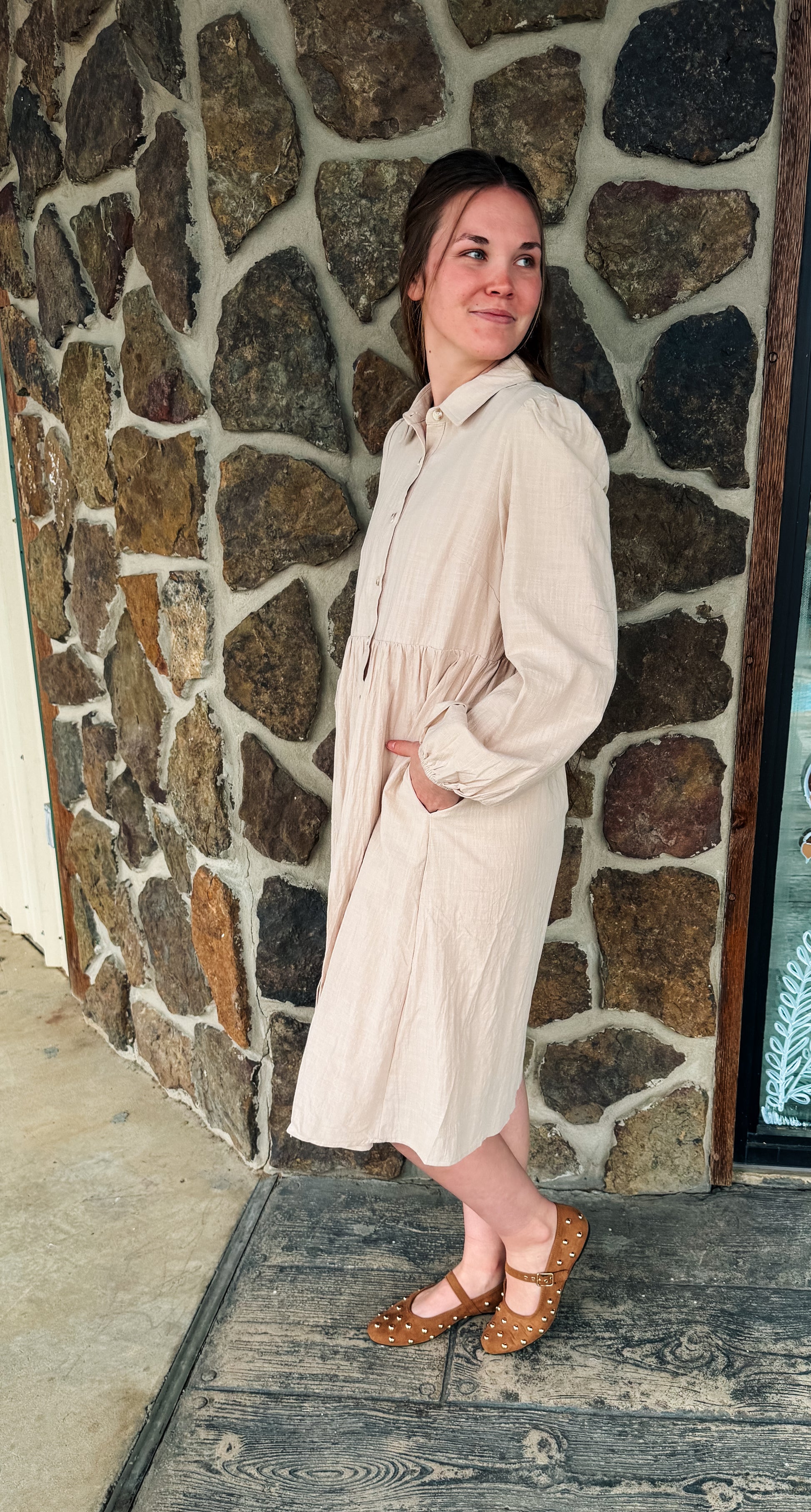A soft cream dress featuring puff sleeves and a full button-down front. Designed with a relaxed fit and lightweight fabric for comfortable everyday wear. Easy to style for both casual and dressy occasions