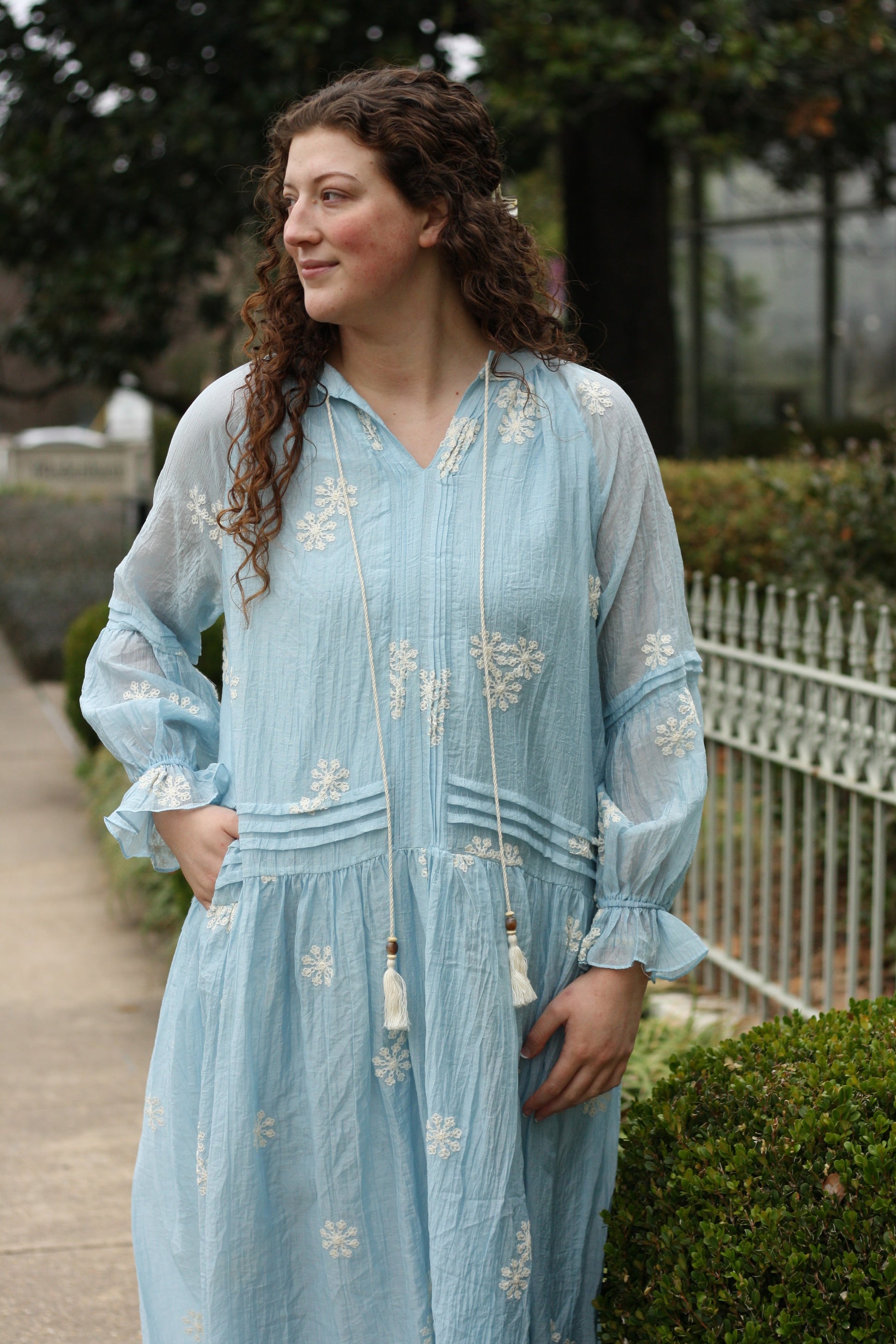 Effortlessly elegant with a touch of bohemian charm, this embroidered long sleeve maxi is made for days when you want to feel both comfortable and elevated. Designed with a flattering drop waist and a fully lined bodice, it flows beautifully with every step. Delicate embroidery adds artisanal detail, while the tassel tie neckline brings a soft, romantic finish.