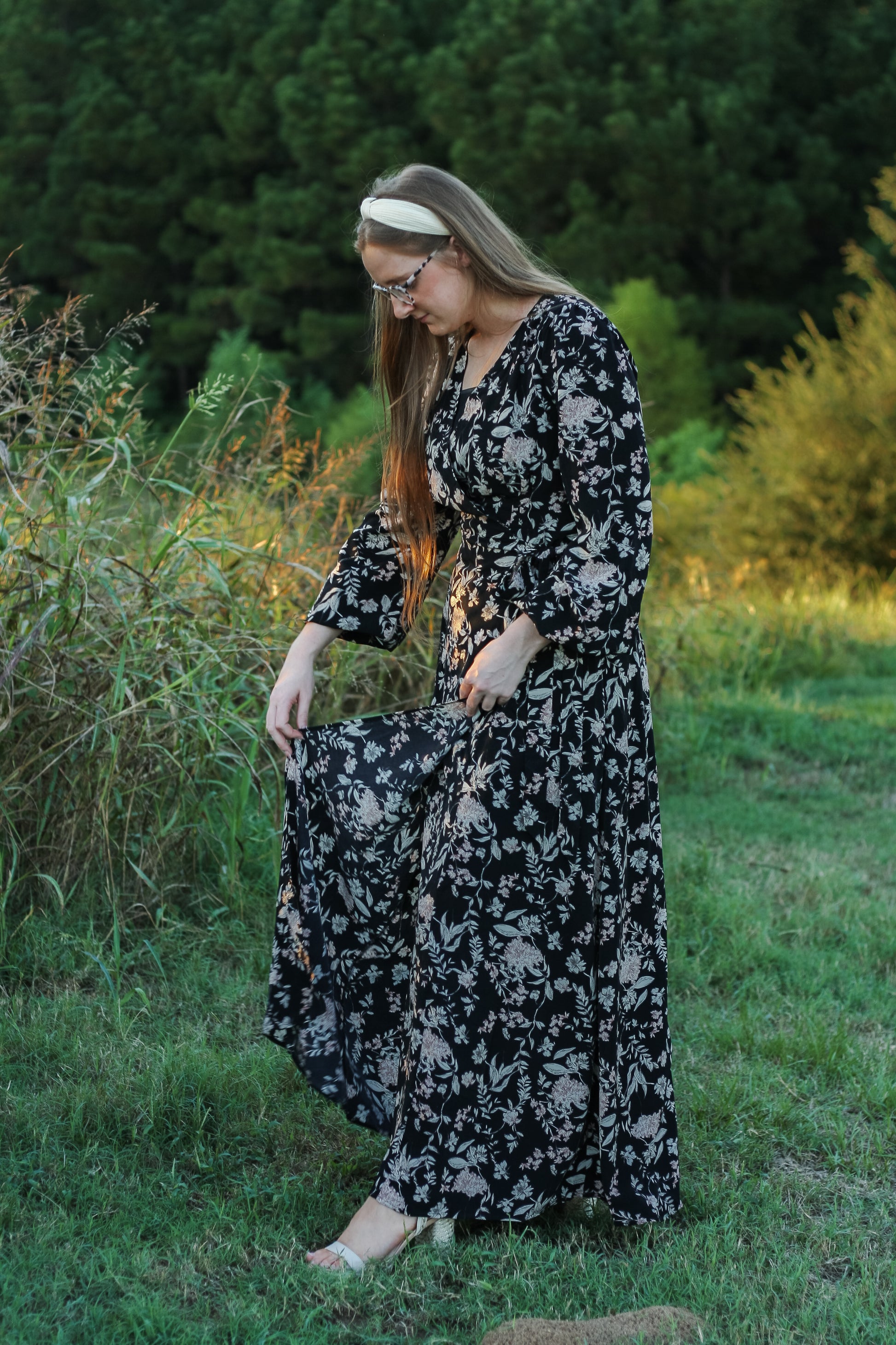 This floral wrap maxi dress is a functional wrap dress with an adjustable waist and a self-tie closure on the side. It showcases a beautiful floral print and has long bell sleeves for added style.