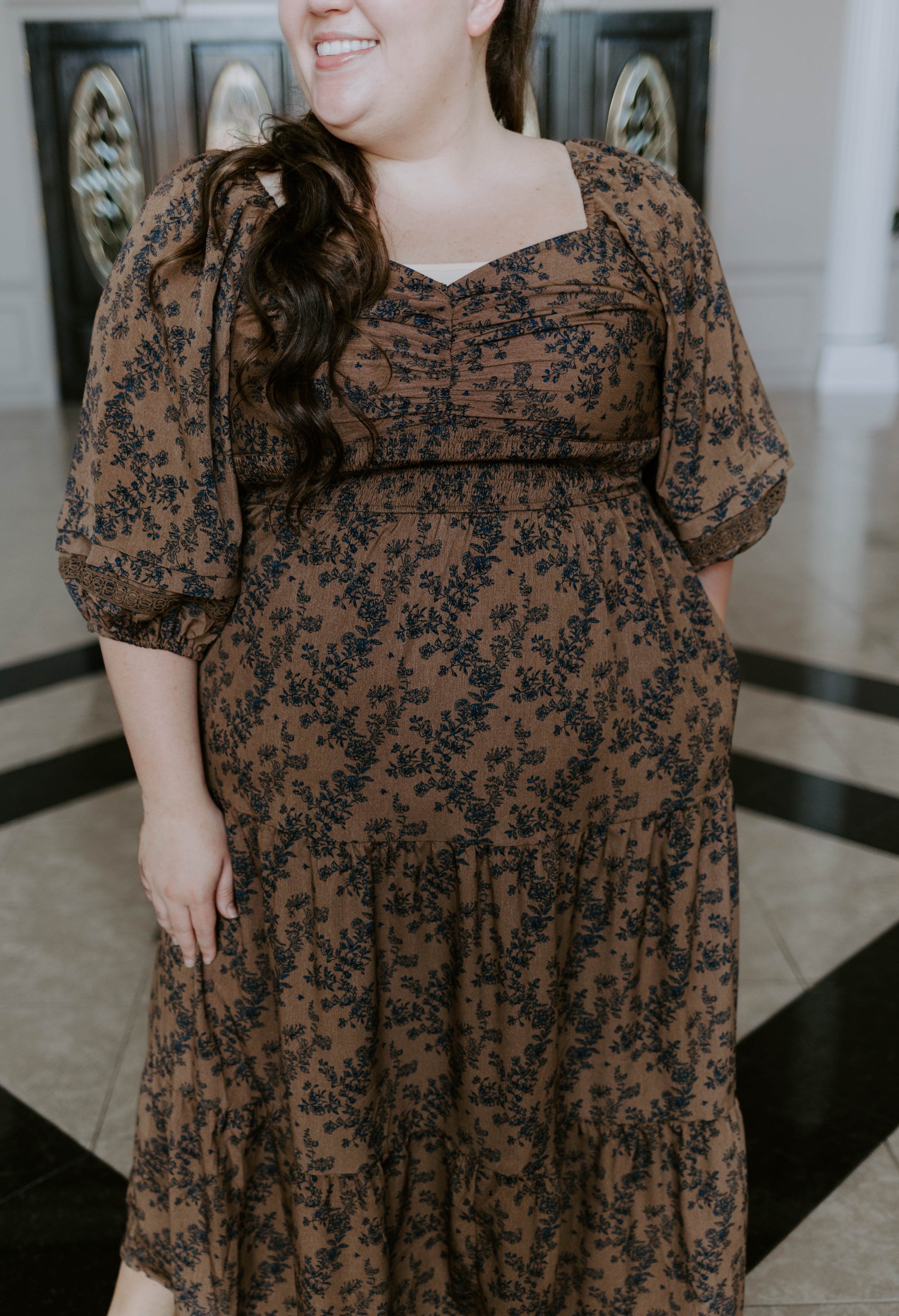 Comfort meets charm in this brown midi dress featuring a delicate floral print, smocked chest, and 3/4 sleeves.