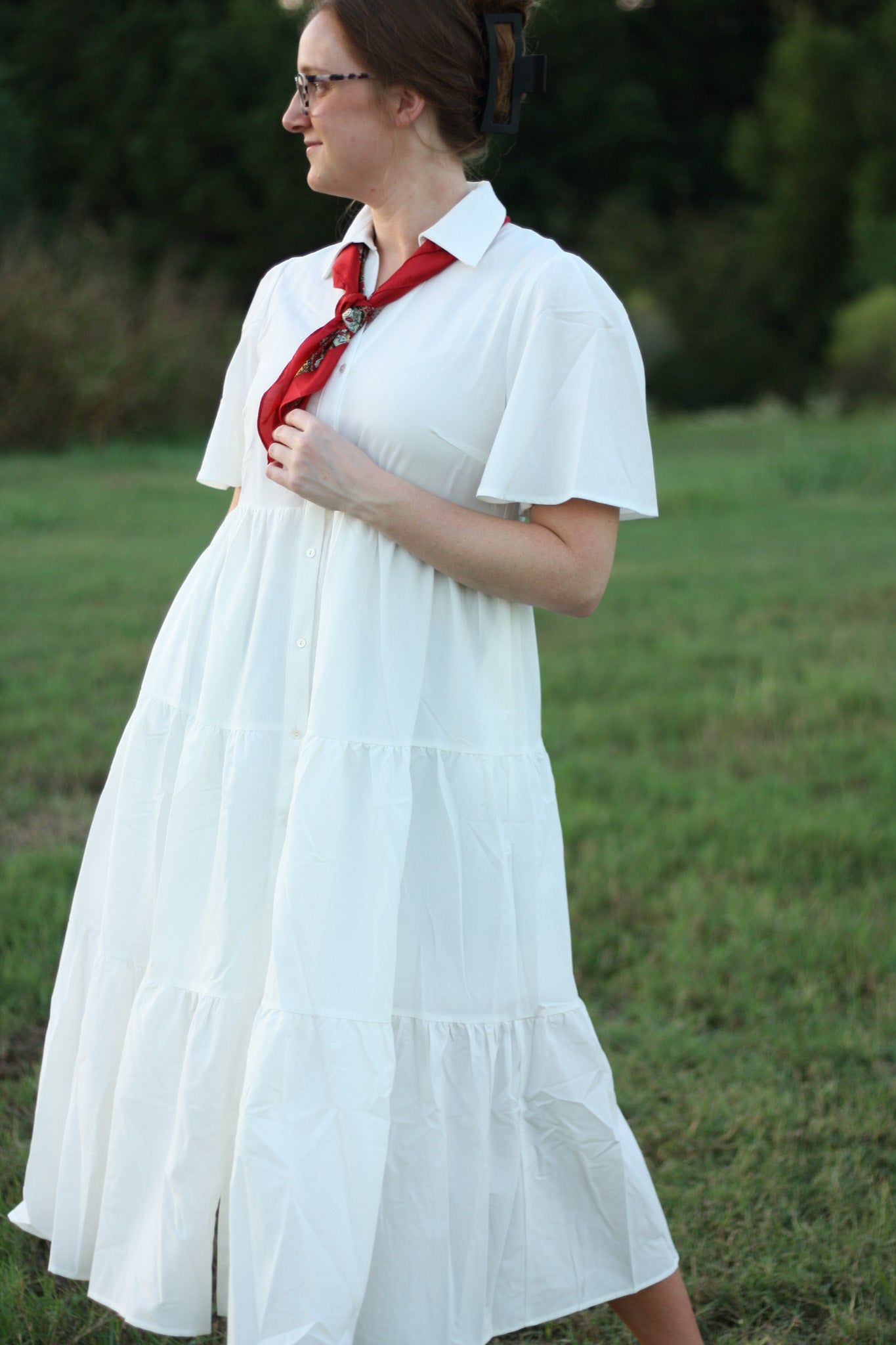 This off-white midi features a flattering collared V-neckline and functional buttons for an elevated look. Short flutter sleeves add a soft, feminine touch, while the hidden side pockets bring both style and convenience.