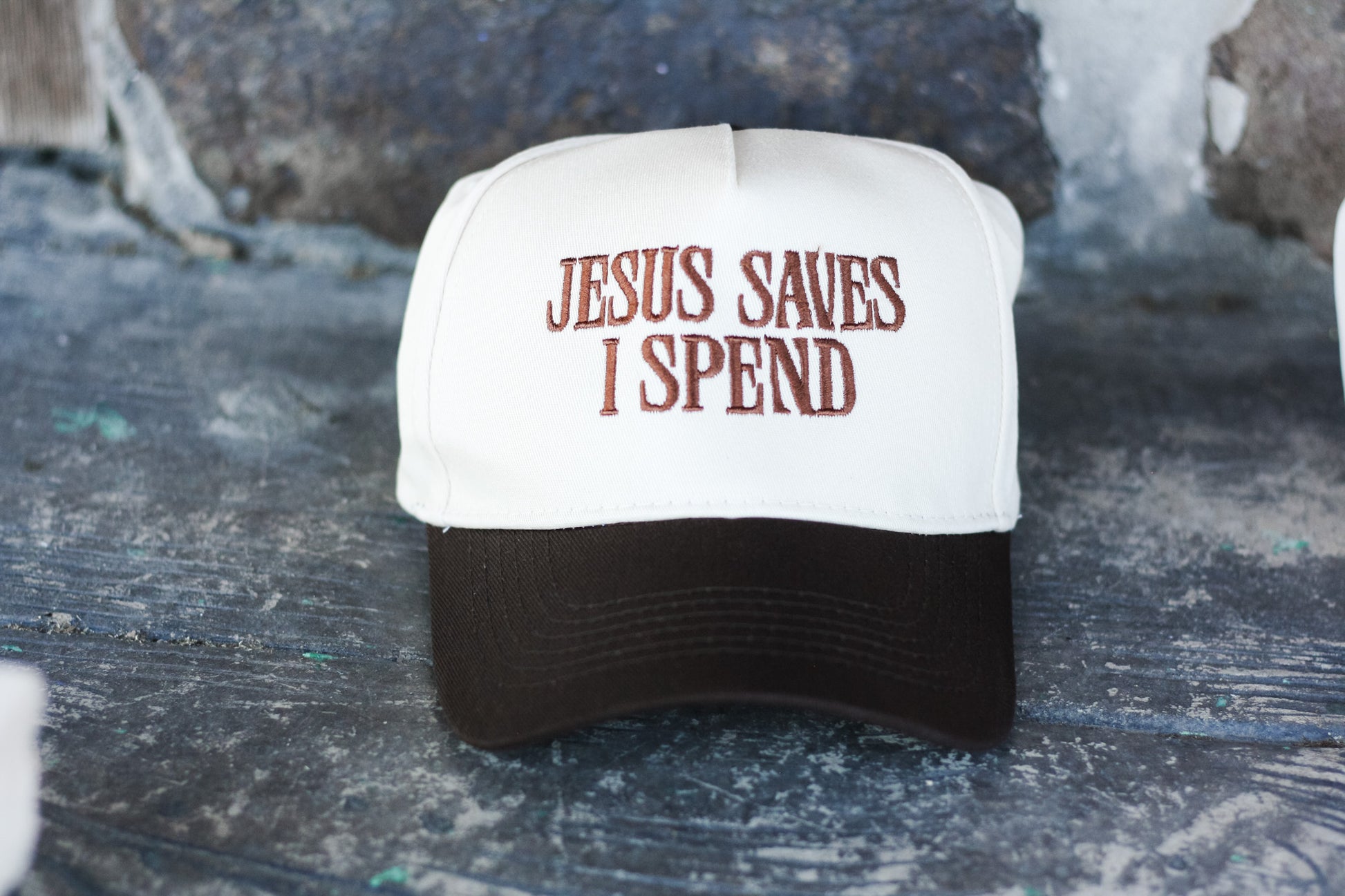 The bold phrase “JESUS SAVES I SPEND” is crisply embroidered on a durable canvas hat, and adjustable snap closure ensures all-day comfort. A playful nod to faith, fashion, and fun!