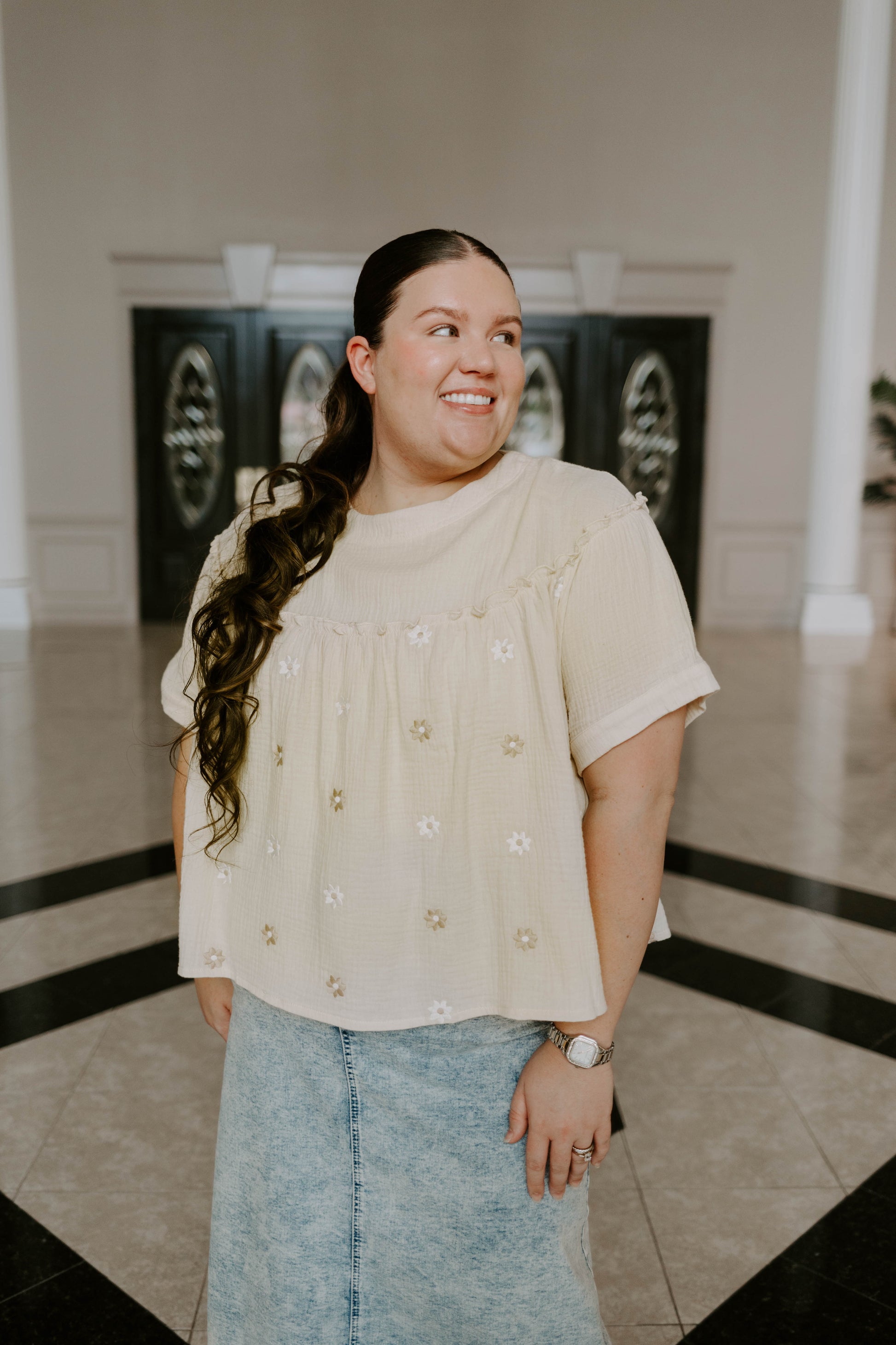 Breezy, comfy, and full of charm—this soft gauze top features delicate embroidery and raw-edge shirring for a laid-back, textured look. Designed in a relaxed fit that flatters every curve.