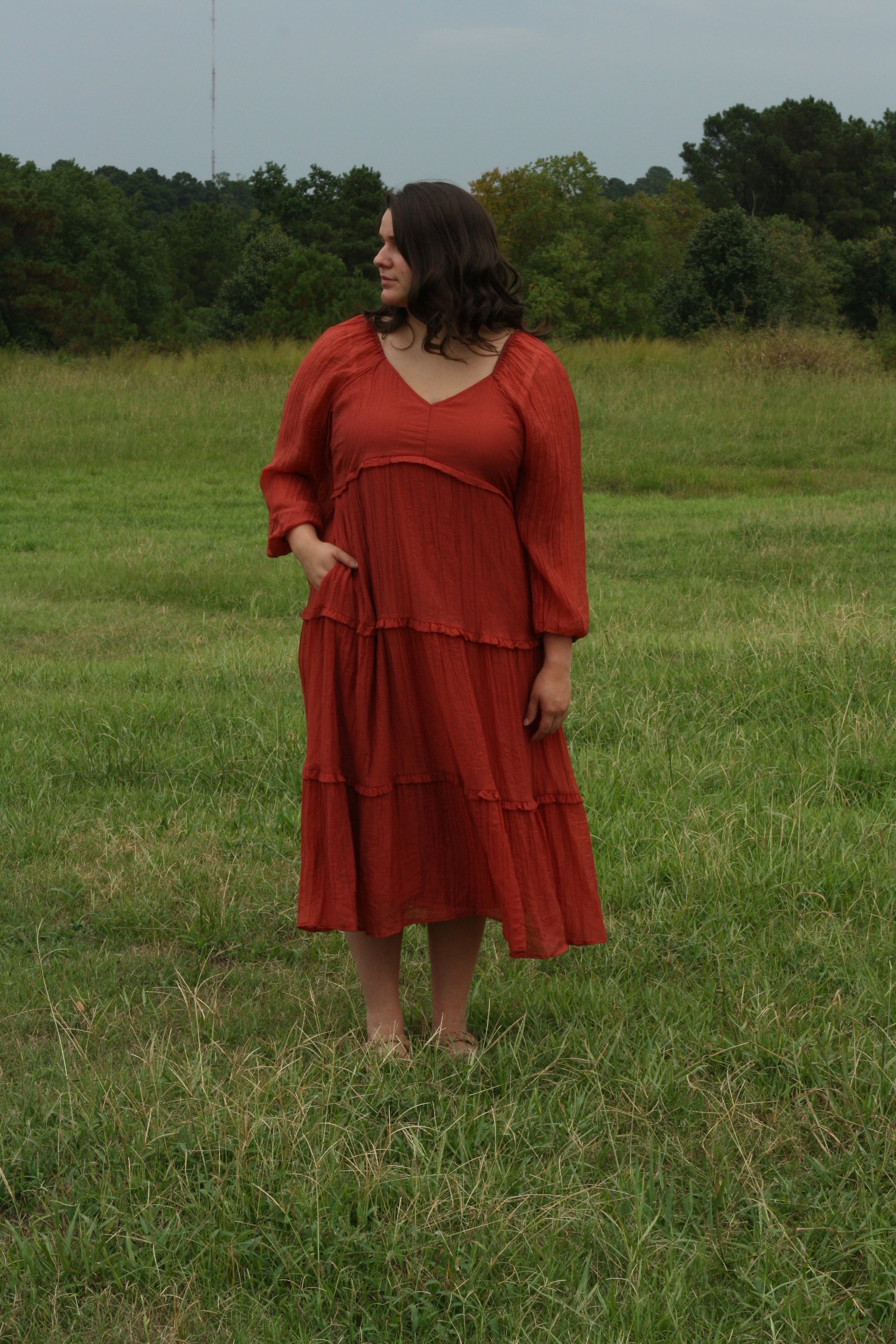 Flowy and flattering, this rust maxi dress features a V-neckline, elastic-banded long sleeves, and a tiered ruffle design. Side pockets add function to the feminine silhouette—perfect for any occasion.