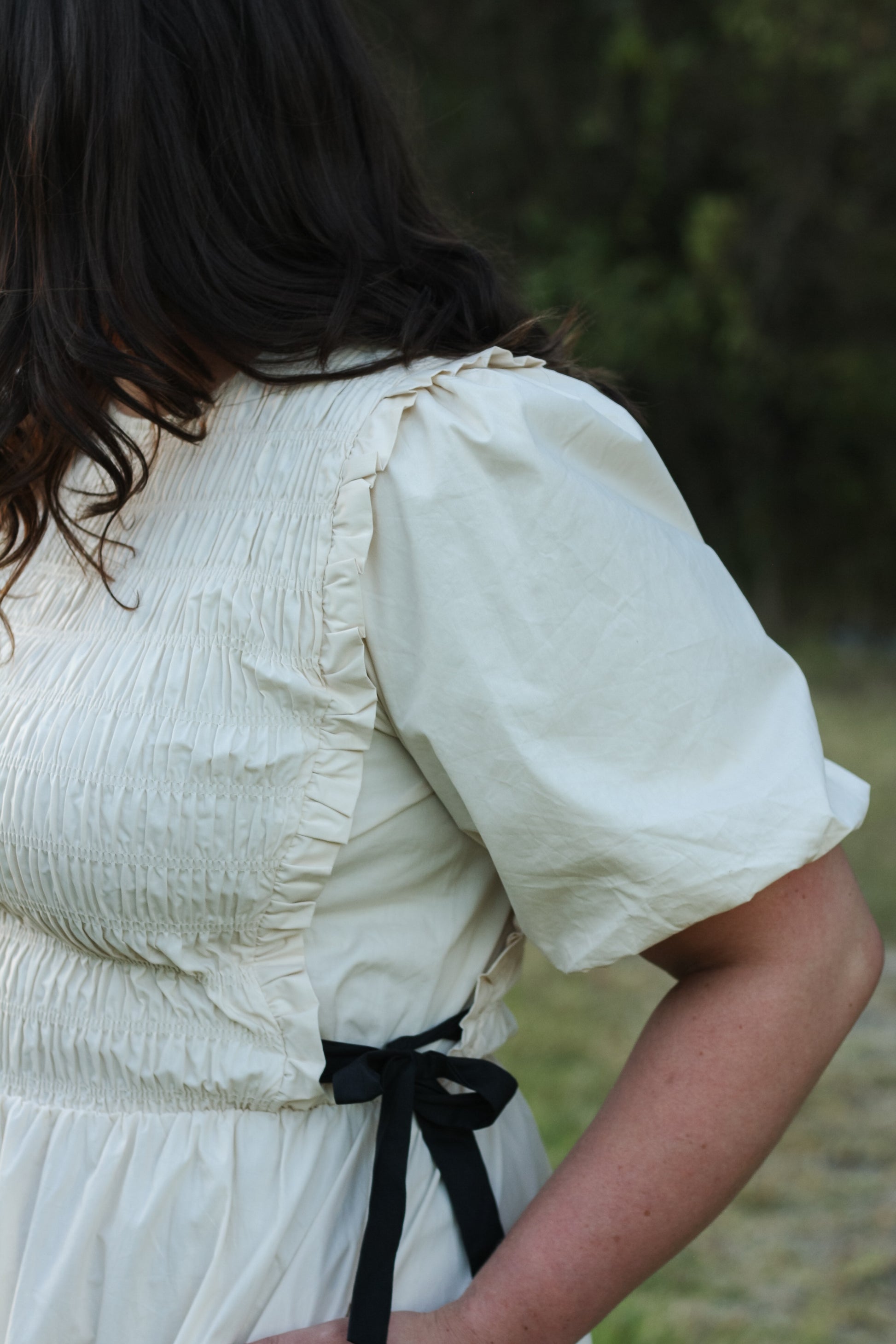 This charming dress combines comfort and style with its smocked bodice and playful short bubble sleeves. The contrast ribbon tie at the side adds the perfect touch of femininity!