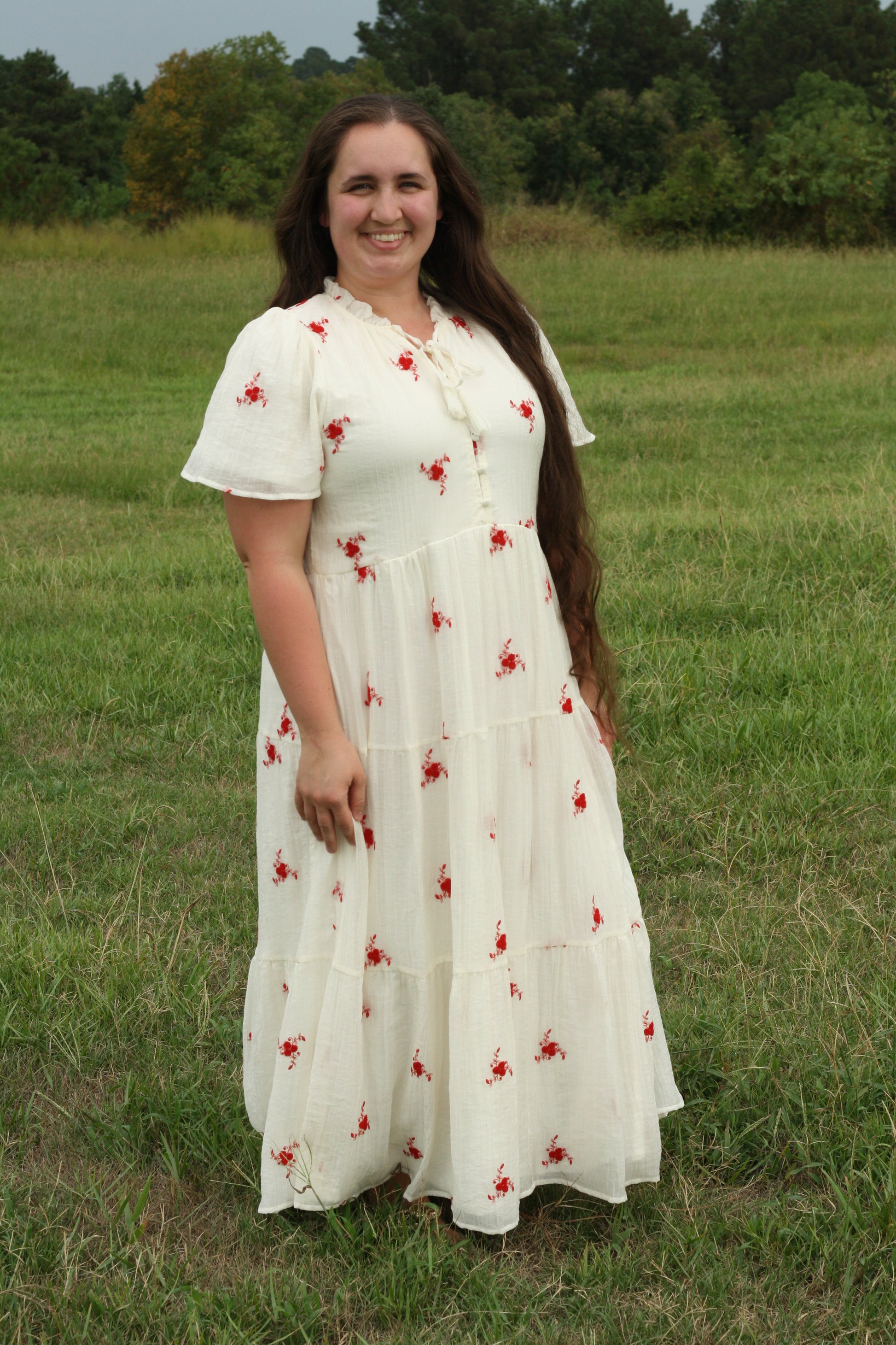 Embrace effortless elegance with this red floral embroidered midi dress, designed to make a statement. The dress features a flattering V-neckline adorned with a tassel tie, adding a touch of bohemian charm. Short, flowing sleeves enhance its airy silhouette, while the intricate floral embroidery brings a pop of color and texture.