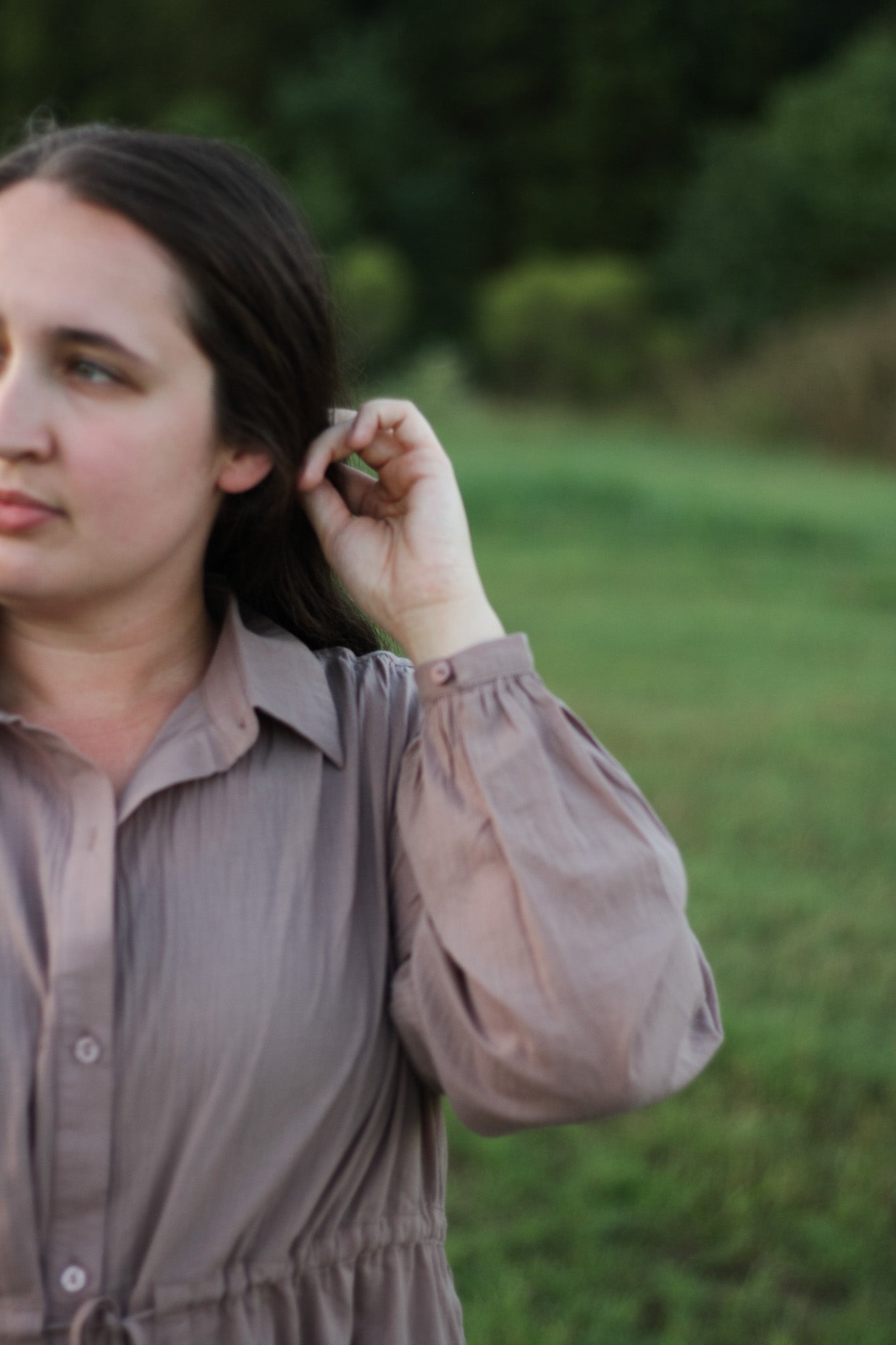 This midi dress features a functional front button closure, long sleeves with buttoned cuffs, a classic collar, and a soft ruffle hem for movement. Finished with side pockets for everyday ease.
