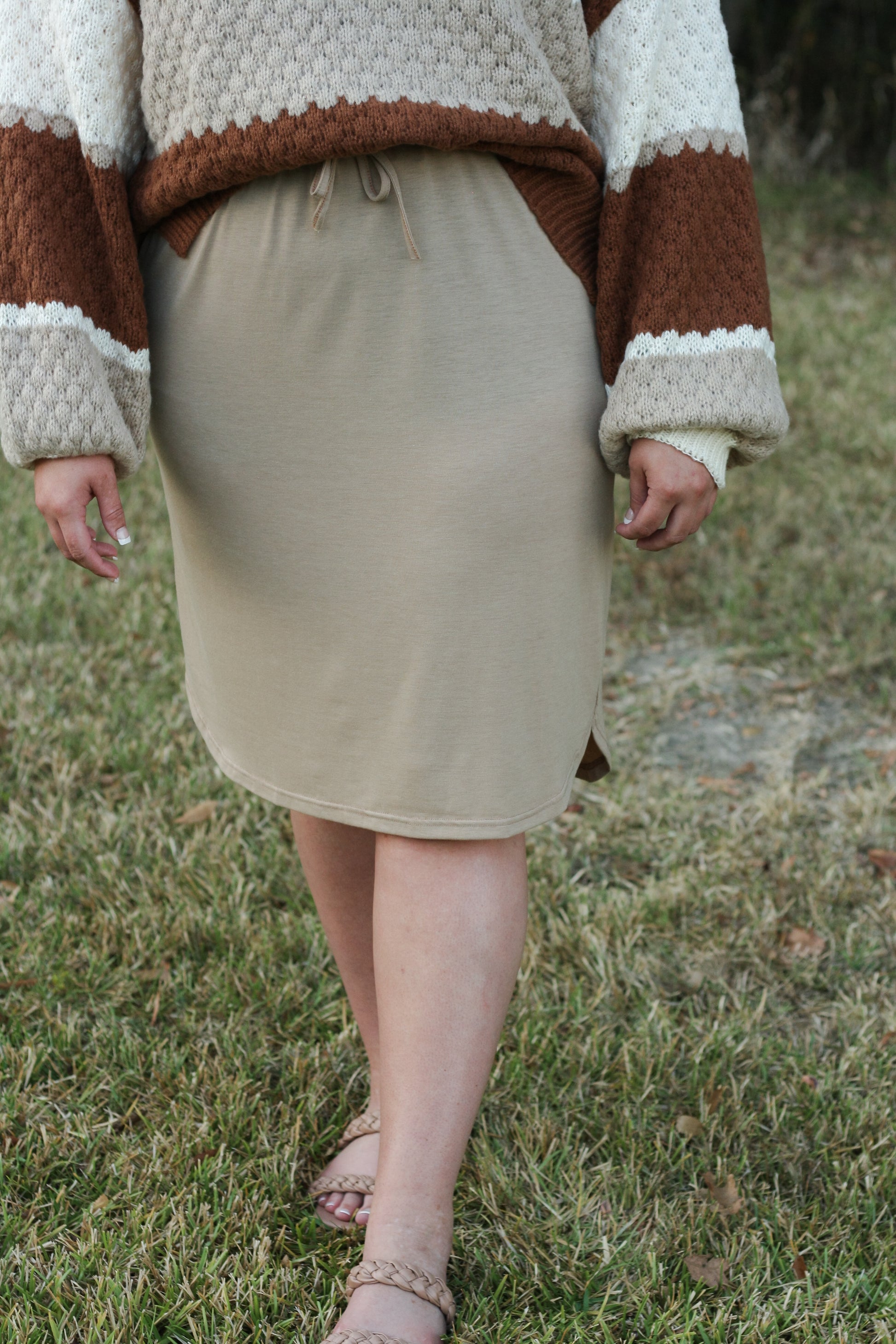 Designed with a soft, lightweight fabric, this skirt features an adjustable tie waist for a flattering fit and a gently curved hem with small side splits that add just the right amount of movement. Both colors are available in our classic and curvy collections!