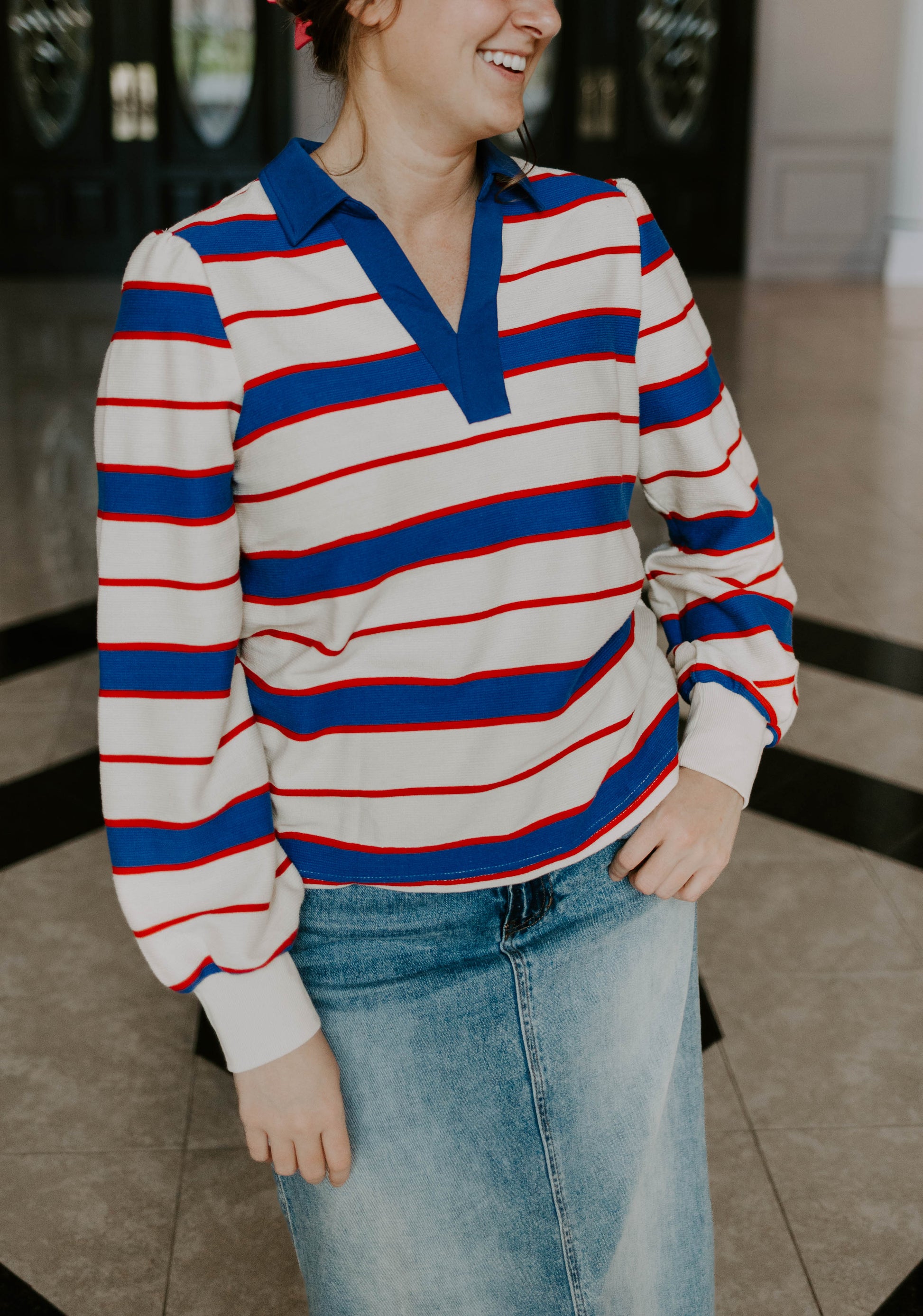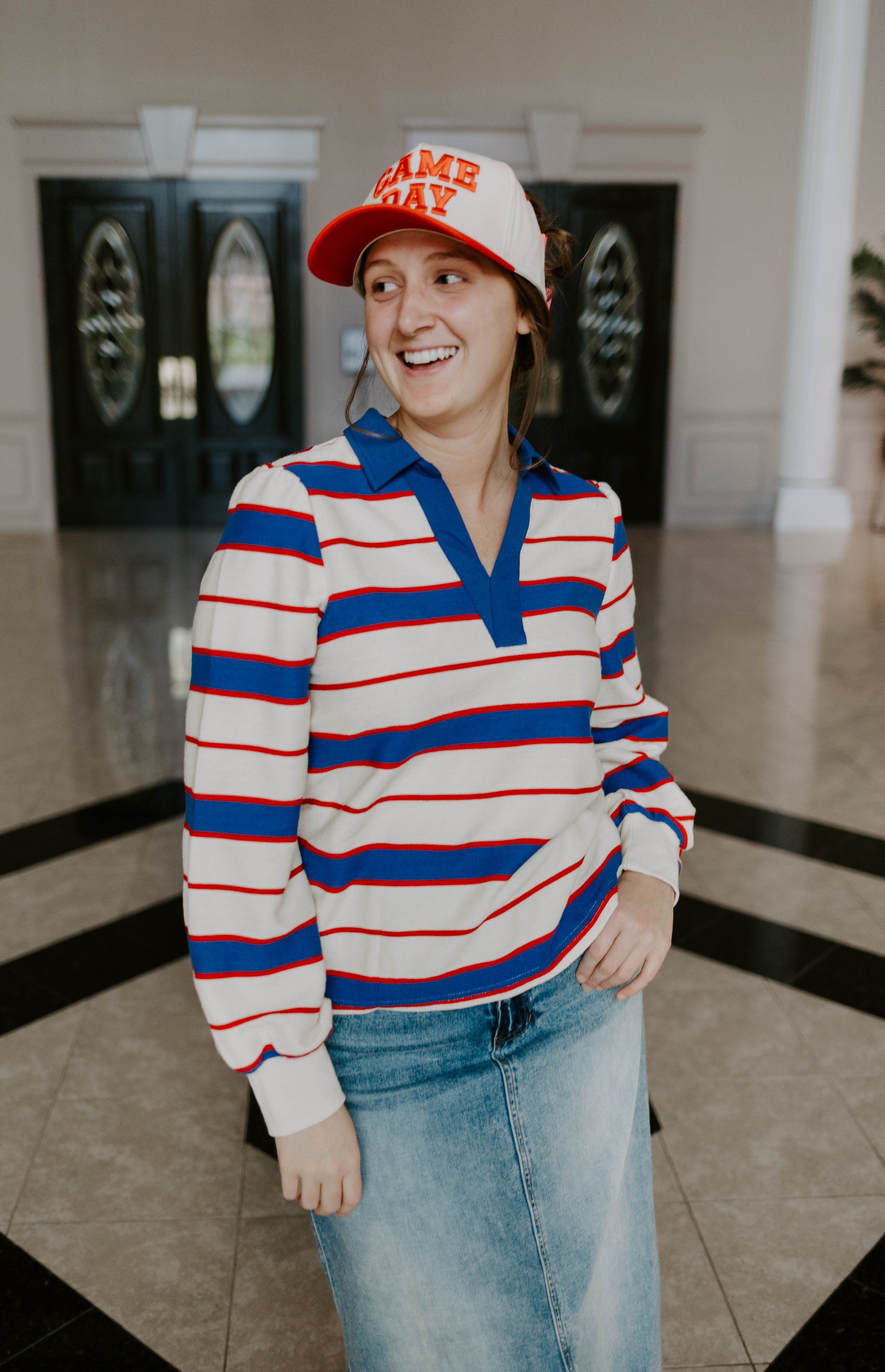 Add a pop of color to your wardrobe with this cozy long sleeve sweatshirt, featuring bold cream, red, and royal blue stripes. Designed with a classic collar and flattering V-neckline, it’s the perfect blend of comfort and sporty style.