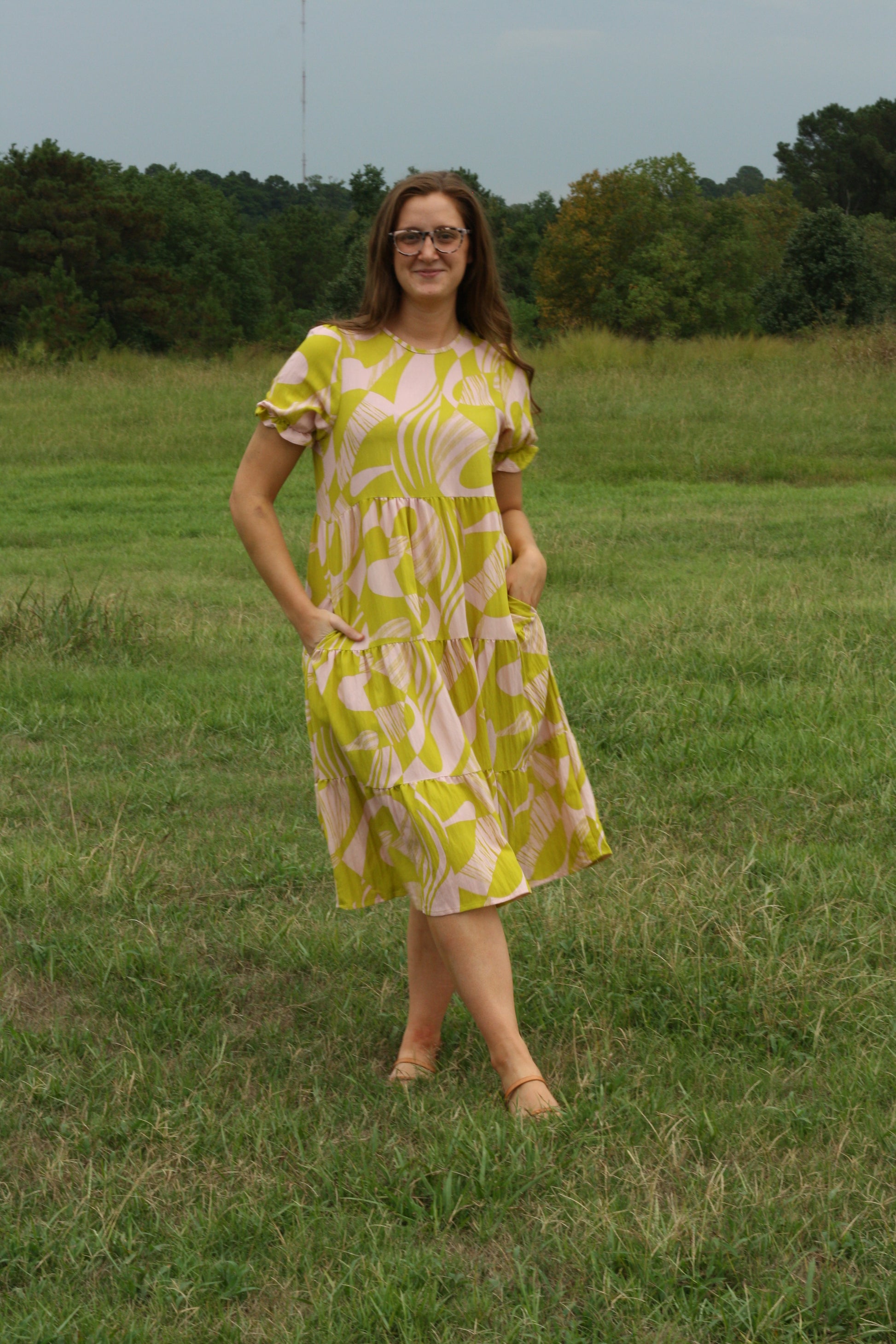 Easygoing and eye-catching, this short sleeve midi dress features a bold geo print and a tiered silhouette for effortless movement.
